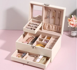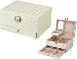 Cette boîte à bijoux stylée en beige est conçue pour une visibilité maximale et la protection de vos trésors. L’intérieur est doublé de velours doux qui évite les rayures, et le couvercle intègre un miroir pratique pour des retouches rapides. Grâce à sa disposition intelligente, vous rangez facilement différents types de bijoux ainsi que des montres.