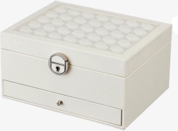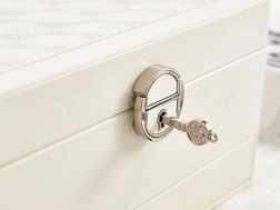 Cuir éco beige avec léger relief, doux rembourrage en velours et fermeture à clé pour protéger vos bijoux et votre intimité.