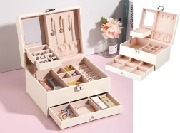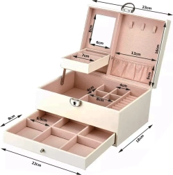 Élégante boîte à bijoux en cuir éco avec intérieur en velours doux, offrant de nombreux compartiments, un tiroir coulissant, un miroir et une fermeture à clé. Idéale pour bagues, boucles d’oreilles, bracelets, colliers et montres – organisation claire et rangement sécurisé réunis.