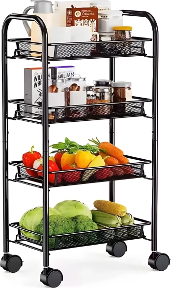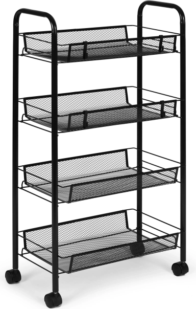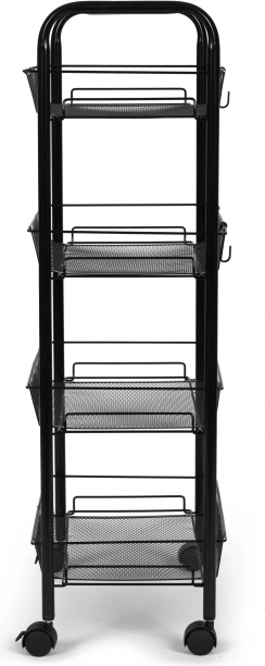 Pratique et élégante, l’étagère ModernHome transforme les espaces étroits ou inutilisés en un rangement malin. Elle offre 4 étagères-panier spacieuses, une structure métallique stable et 4 roulettes (dont 2 avec frein) pour un déplacement facile. Idéale pour la cuisine, la salle de bain, le salon et le bureau, avec 4 crochets pour les petits objets et accessoires.