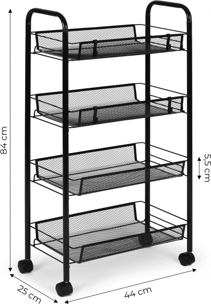 Cette étagère universelle sur roulettes offre un rangement clair pour les épices, les aliments, les serviettes, les cosmétiques, les livres ou les jouets. La structure panier en fil métallique ouvert assure une excellente visibilité et ventilation, tandis que le cadre métallique garantit durabilité et longévité. Grâce à ses dimensions compactes 84 × 44 × 25 cm, elle exploite facilement les espaces étroits près du plan de travail ou d’une armoire.