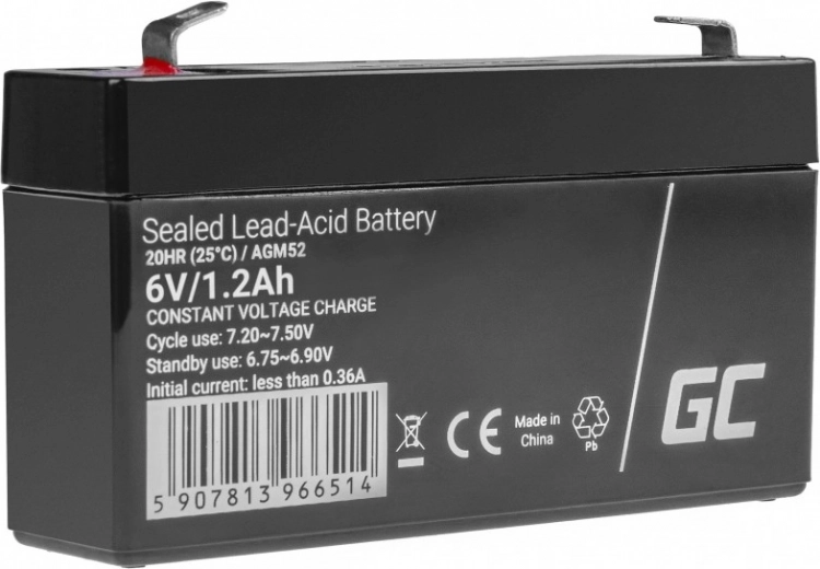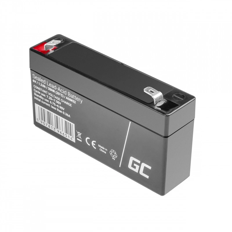 Batterie compacte sans entretien AGM VRLA 6 V / 1,2 Ah de GREEN CELL, une source d’énergie fiable pour les systèmes de sécurité, les caisses, les jouets et d’autres appareils. La technologie AGM assure un fonctionnement sûr dans différentes positions, une faible autodécharge et une longue durée de vie de plus de 5 ans.
