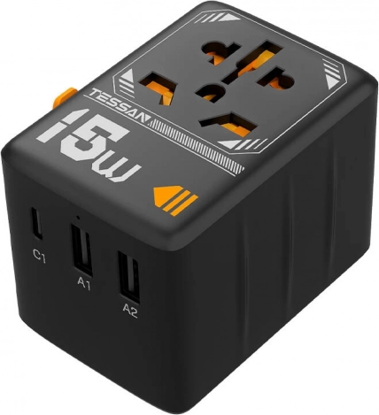 Adaptateur de voyage universel TESSAN avec fiches interchangeables EU/UK/AU/US et une puissance jusqu’à 2500 W, permettant d’alimenter vos appareils en toute sécurité partout dans le monde. Il dispose de 2× USB‑A et 1× USB‑C pour une charge rapide de jusqu’à 3 appareils simultanément (jusqu’à 15 W via USB‑C). Ses dimensions compactes économisent de la place dans les bagages et le fusible remplaçable 250 V / 10 A assure un haut niveau de sécurité.