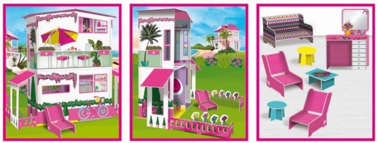 Construisez votre propre maison de poupée BARBIE 3D en carton de haute qualité. Une villa à deux étages de dimensions 73 × 67 × 22 cm pouvant accueillir une poupée Barbie originale et offrant du mobilier et des accessoires de jardin pour des heures de créativité et de jeu.