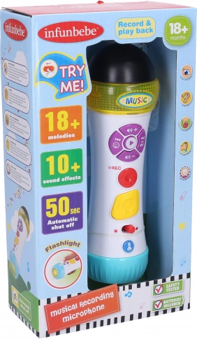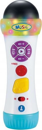 Microphone avec effets lumineux et modulateur de voix. 3 modes, réglage du volume et de la hauteur, haut‑parleur amovible. Pour enfants dès 8 ans.