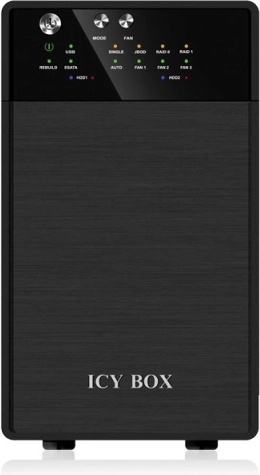 Boîtier RAID externe ICY BOX pour 2× 3,5" SATA avec USB 3.0 et eSATA. RAID 0/1, JBOD, BIG, ventilateur silencieux, travail rapide avec de gros volumes de données sur PC et Mac.