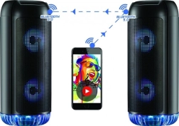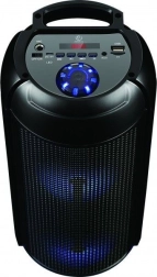 À l’intérieur, on trouve 2 × 4" (102 mm) haut-parleurs avec bass reflex pour des basses plus marquées et des aigus clairs sur la plage 40 Hz – 20 kHz. La batterie Li‑Ion intégrée de 1200 mAh offre 4 à 8 heures de musique, la charge se fait facilement via micro USB. Les commandes comprennent des boutons multimédias, une molette rotative et un écran LED lisible. Le rétroéclairage RGB des haut-parleurs et de la base peut être désactivé par un appui long sur le bouton M.