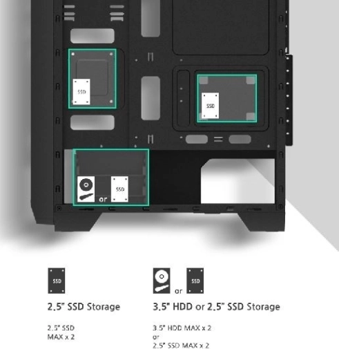 • Stockage : jusqu’à 2× HDD 3,5" et 2× SSD 2,5"