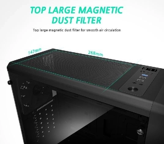 Le filtre supérieur magnétique et le filtre anti‑poussière inférieur protègent la configuration de la poussière et facilitent l’entretien régulier.