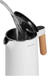 Design stylé : La bouilloire Concept RK3300 Salt-Pepper embellit chaque foyer. Son apparence élégante est soulignée par un corps blanc mat sur une base minimaliste, complétée par une poignée en bois élégante. Avec une capacité de 1,5 l, vous pouvez préparer jusqu'à 6 tasses de votre boisson chaude préférée.