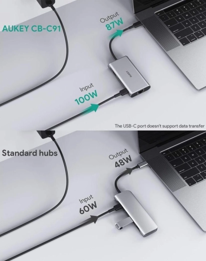 Aukey CB-C91 offre un débit de transfert de données de 5 Gb/s et, grâce à l’interface HDMI, l’envoi d’une résolution allant jusqu’à 4K @ 30 Hz vers l’écran connecté ne posera aucun problème. Le port Ethernet Gigabit prend en charge des vitesses réseau jusqu’à 1 000 Mb/s. Vous pouvez également recharger vos appareils préférés sans difficulté. Grâce à la technologie Power Delivery, votre ordinateur portable peut être alimenté avec une puissance de 100 W, même lorsque vous utilisez d’autres fonctions du hub. La charge n’a jamais été aussi rapide ; vous vous habituerez à ce niveau de performance élevé dès le premier jour, et l’Aukey CB-C91 deviendra pour vous un support précieux (et indispensable!).
