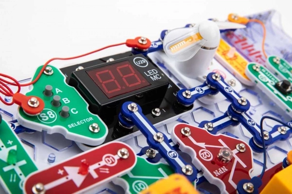 - 1× plaque, 35× composants (p. ex. avion, mini-voiture, haut-parleur, détecteur de mouvement, moteur avec boîte de vitesses), 1× manuel (à télécharger en ligne)
