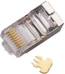 Connecteur traversant universel RJ45 8P8C avec blindage STP pour câbles de catégorie Cat 5e. Grâce à sa conception traversante, il permet un montage rapide et précis, un alignement uniforme des paires et un sertissage fiable avec contrôle visuel de l’ordre des conducteurs.