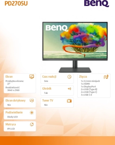 Moniteur 27" BENQ PD2705U IPS 4K, 5 ms, HDMI/DP/USB-C