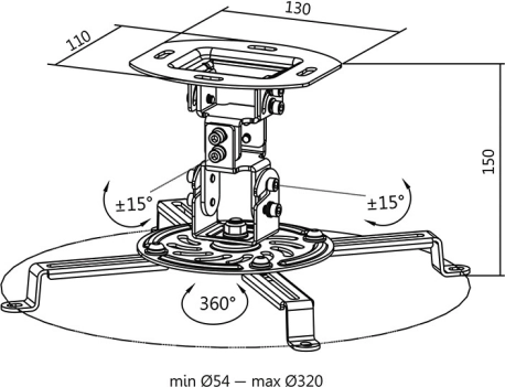 Les bras réglables couvrent des entraxes de 54 à 320 mm (Ø), ce qui permet d’adapter facilement le support à la plupart des projecteurs de différentes marques et tailles.