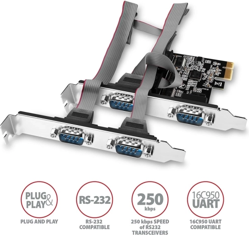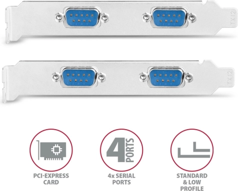 La carte PCI-Express AXAGON PCEA-S4N ajoute à votre PC quatre ports série RS-232 avec connecteurs DB9. Grâce au chipset éprouvé ASIX AX99100, elle garantit une communication stable, une haute bande passante et une compatibilité totale avec les équipements industriels, les systèmes de caisse et les machines CNC. L’installation est simple grâce à la prise en charge Plug and Play et aux équerres fournies pour boîtiers standard et low-profile.