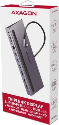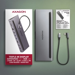 Hub multiport USB-C Axagon HMC-4KX3 étend votre ordinateur portable jusqu'à onze ports et un lecteur de carte mémoire. Connectez facilement trois moniteurs en 4K, trois appareils USB, un réseau Ethernet Gigabit, des écouteurs et un lecteur de cartes SD/microSD avec un seul connecteur USB-C réversible.