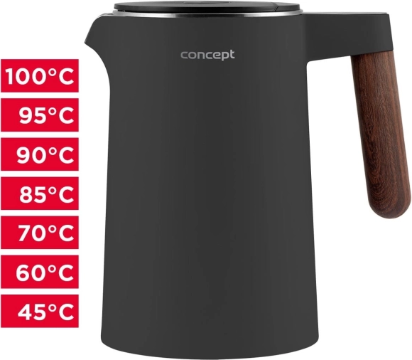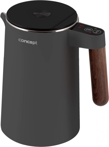 La bouilloire Concept RK3305 Norwood séduit par sa finition mate gris foncé et son élégant décor bois sur la poignée, s’intégrant parfaitement dans une cuisine moderne. Sa capacité de 1,5 litre est idéale pour la préparation quotidienne de thés, cafés et aliments pour bébé.