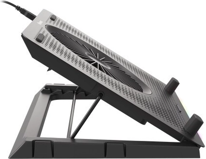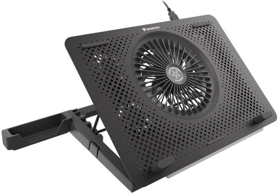 Le système de refroidissement se compose d’un grand ventilateur pour l’admission d’air frais et de quatre petits ventilateurs pour une évacuation efficace de la chaleur. Grâce au contrôle bi-niveau de la vitesse, vous adaptez facilement la performance au travail ou au jeu en cours. Les 5 niveaux d’inclinaison améliorent l’ergonomie et le confort, tandis que les butées et pieds en caoutchouc maintiennent l’ordinateur portable bien en place.