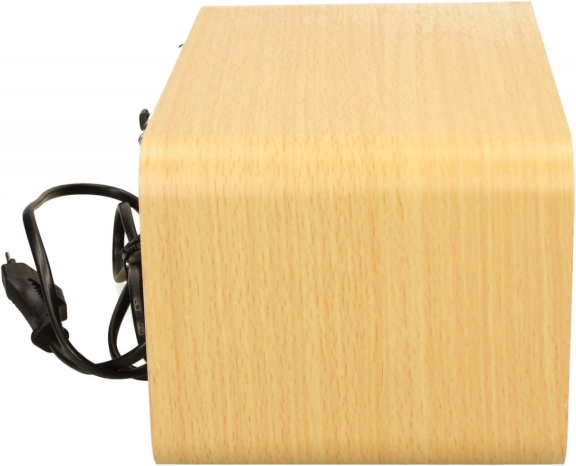 Le corps en bois favorise un rendu plus chaleureux des voix et de la musique, tandis que l’alimentation secteur assure une écoute stable sans changer de piles.