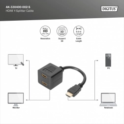 Le splitter HDMI passif est la solution idéale pour connecter deux téléviseurs ou moniteurs à un seul connecteur HDMI de l'ordinateur ou du portable, avec prise en charge de la qualité Full HD (1080p). Il n'est pas possible d'utiliser les deux appareils simultanément.