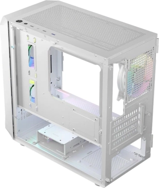 Prêt pour la performance : accueille une GPU jusqu’à 340 mm, un refroidisseur CPU jusqu’à 155 mm et prend en charge le watercooling. Grâce aux filtres anti‑poussière sous l’alimentation, sur le dessus et à la façade mesh, la configuration reste plus propre et plus silencieuse. Le panneau I/O supérieur propose USB 3.0, deux USB 2.0, un combo audio 3,5 mm, le bouton Power et un bouton de contrôle du rétroéclairage ARGB.
