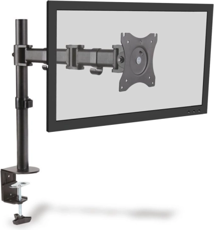 Support de bureau universel pour un moniteur jusqu’à 27" avec une capacité de 8 kg, offrant un réglage ergonomique, une rotation à 360° (pivot) et une inclinaison ±45°. Montage par pince robuste sur le plateau de table, compatible avec les standards VESA 75x75 et 100x100. Le passage de câbles intégré maintient l’espace de travail propre et ordonné.
