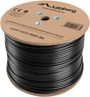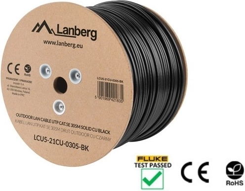 Câble UTP extérieur professionnel CAT5e de 305 m en cuivre pur pour des installations réseau fiables. Il offre des conducteurs 100 % cuivre, AWG 24 – âme pleine, gaine PE résistante et un fonctionnement jusqu’à 100 MHz pour une transmission stable jusqu’à 100 m.