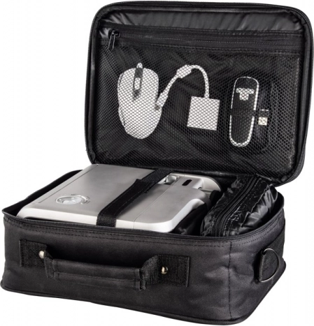 L’intérieur bien pensé avec une cloison coulissante et amovible permet d’adapter facilement l’espace au projecteur et à ses accessoires. Une poche séparée pour documents, une poche intérieure en maille avec fermeture éclair dissimulée et une poche extérieure avant assurent un rangement clair de tous les essentiels – des câbles à la télécommande.
