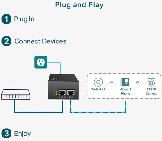 Étendez votre réseau facilement et efficacement avec un injecteur PoE++ qui combine données et alimentation sur un seul câble Ethernet. Deux ports Gigabit assurent une haute bande passante, tandis que la prise en charge IEEE 802.3af/at/bt permet d’alimenter une large gamme d’appareils, y compris caméras, points d’accès et téléphones IP.