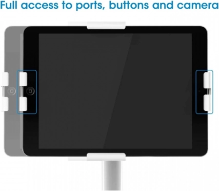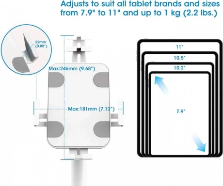 Des pinces réglables s’adaptent aux tablettes de toute marque avec diagonale de 7,9 à 11 pouces et maintiennent l’accès aux ports, boutons et caméras avant/arrière. Le dos doux et les coussinets en mousse fournis empêchent les rayures sur l’appareil.
