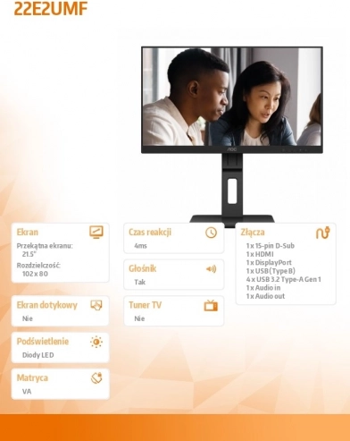Moniteur AOC 21,5" VA avec pivot, HDMI/DP et haut-parleurs