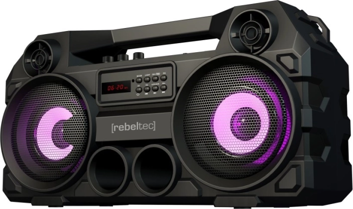 L’enceinte offre une connectivité étendue : Bluetooth 5.0 pour le contrôle depuis un smartphone, radio FM, lecture depuis clé USB, carte microSD, entrée ligne AUX et mode karaoké. Le rétroéclairage RGB multicolore avec plusieurs modes peut être désactivé à tout moment ; s’ajoutent un écran LED clair, 8 boutons multimédias et 3 commandes rotatives pour un pilotage intuitif.