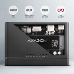 Pour un fonctionnement stable avec les SSD, les technologies UASP pour de meilleures performances, TRIM pour la longévité et le monitoring S.M.A.R.T. sont disponibles. L’adaptateur prend en charge le boot depuis les disques connectés, Auto Spindown en cas d’inactivité et Turn Off après déconnexion ou mise en veille du PC. L’alimentation par USB suffit pour les disques M.2 et 2,5", pour les HDD 3,5" un adaptateur externe 12 V / 2 A est fourni.