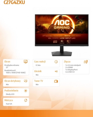 Le moniteur incurvé 27" AOC C27G4ZXU vous immerge grâce à la combinaison d’une dalle Fast VA et d’un taux de rafraîchissement élevé de 280 Hz. Animations fluides, flou de mouvement minimal et excellent contraste font de ce modèle un choix idéal pour le jeu compétitif, les titres d’action et l’e‑sport rapide.