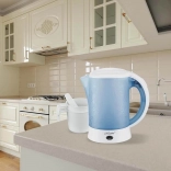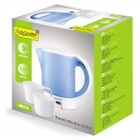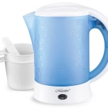 Fabriquée en plastique résistant, la bouilloire est légère et facile à transporter. L’emballage comprend deux tasses de 150 ml et deux cuillères, ce qui en fait un choix idéal pour un petit-déjeuner rapide ou un thé en déplacement.