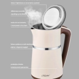 Parmi ses autres caractéristiques remarquables, on trouve un couvercle amovible avec joint en silicone qui facilite le remplissage et l'entretien de l'appareil. Les fonctions de sécurité incluent un arrêt automatique après ébullition et une protection contre la surchauffe. L'élément chauffant caché assure un chauffage rapide de l'eau et, grâce à la longueur du câble d'alimentation de 70 cm, la manipulation de la bouilloire est pratique. Le design moderne avec des dimensions de 23 x 21 x 15,5 cm allie esthétique et fonctionnalité.