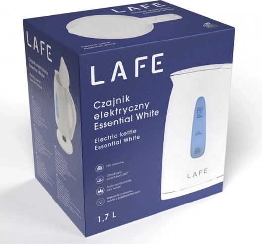La bouilloire électrique LAFE Essential, élégante et fiable, en couleur blanche, offre un chauffage rapide grâce à une puissance de 2200 W, une utilisation en toute sécurité et un contrôle facile du niveau d’eau grâce à l’indicateur rétroéclairé. La résistance chauffante disque pratique, le filtre anti-calcaire et l’arrêt automatique à sec en font un choix idéal au quotidien.