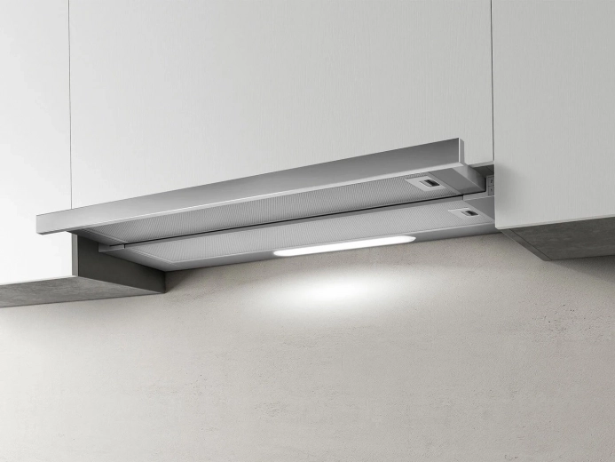 La hotte télescopique Elite 14 se dissimule entièrement dans le meuble lorsqu’elle n’est pas utilisée, ce qui économise de l’espace et préserve le design épuré de la cuisine. L’activation est simple : il suffit de tirer le panneau frontal et de choisir la vitesse souhaitée. Ce modèle est fabriqué en acier inox de haute qualité protégé par un revêtement spécial. Les boutons intuitifs permettent de changer rapidement le mode de fonctionnement et l’éclairage halogène fournit une lumière suffisante pendant la cuisson.