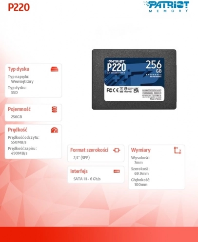 Patriot P220 256 Go SSD 2,5" SATA III avec vitesses jusqu’à 550/500 Mo/s. Disque fin de 7 mm pour une mise à niveau rapide d’un ordinateur portable ou de bureau. Performances fiables et garantie 3 ans.