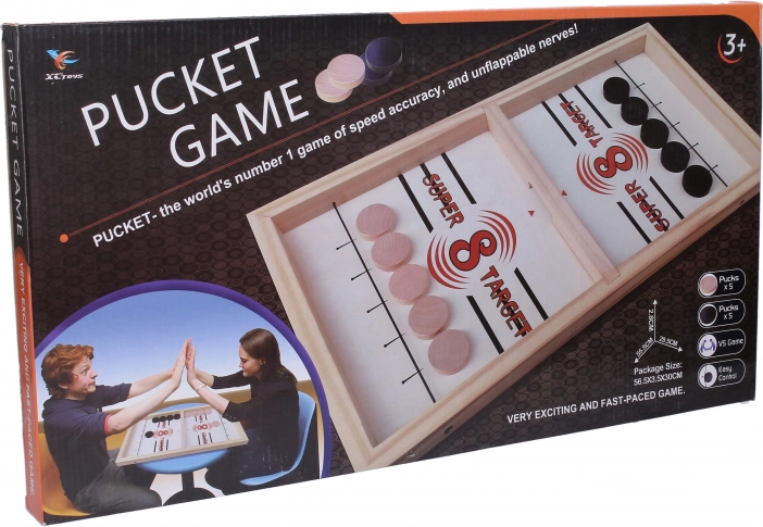 Nous vous présentons le hockey sur table en bois, parfait pour chaque soirée familiale ou rencontres amicales. Ce jeu est conçu pour que les enfants dès 3 ans ainsi que les adultes puissent y participer. Il suffit de prendre cinq palets, de tendre la corde et d'essayer d'en envoyer le plus possible du côté de l'adversaire.