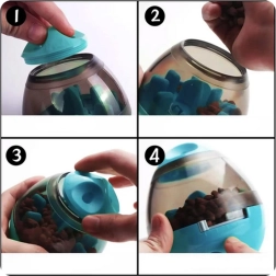 Ouvrez la balle par rotation, versez les croquettes et réglez la taille de l’ouverture selon les friandises et le niveau de difficulté souhaité. Utilisation et nettoyage simples.