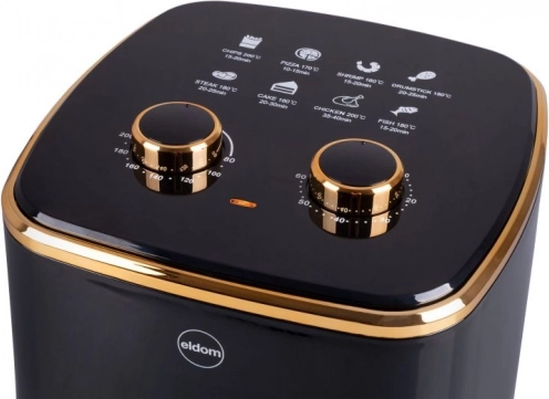Savourez des plats croustillants et sains avec la friteuse à air chaud Eldom de 5 l. Grâce à la technologie de circulation d’air chaud à 360°, vous préparez des repas avec jusqu’à 80 % de matières grasses en moins, tout en conservant pleinement leur goût et leur couleur. Elle offre 9 programmes, un préchauffage rapide en 2 minutes, un réglage continu de la température de 80 à 200 °C et un minuteur de 60 minutes. La commande par deux boutons rotatifs est intuitive, le panier amovible avec revêtement antiadhésif se nettoie facilement, et l’appareil dispose d’une protection contre la surchauffe ainsi que de pieds antidérapants.