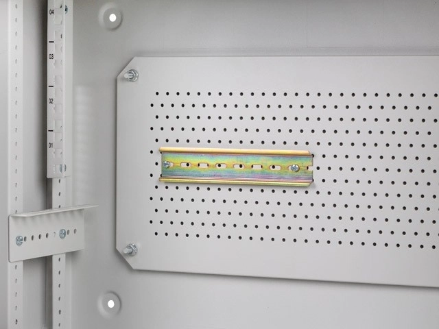 À l’arrière se trouve une plaque de montage perforée (mesh) pour vis M4 et un rail DIN fourni pour une fixation facile des accessoires. Sont inclus le conducteur de mise à la terre, les chevilles et les vis M6 pour une fixation solide et sécurisée. Huit passe-cloisons sécables sur le panneau arrière offrent une grande flexibilité pour les câbles d’alimentation et de données.