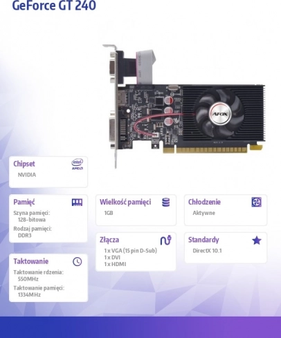 La carte graphique GeForce GT 240 offre des performances équilibrées pour le multimédia, les jeux plus anciens et les usages bureautiques. Grâce à 1 Go de DDR3, un bus 128 bits et l’interface PCI‑Express 2.0, elle assure une image fluide et un fonctionnement fiable. Elle propose des sorties HDMI, DVI et VGA et un format compact low profile avec refroidissement actif pour un fonctionnement silencieux et efficace.