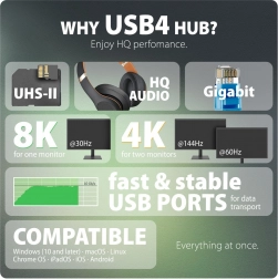 Transformez votre ordinateur portable, tablette ou téléphone en un véritable centre multimédia avec la station AXAGON HMC-U4 12‑en‑1. Grâce à la technologie USB4 à 40 Gb/s, profitez d’un double affichage 4K (jusqu’à 8K/30 Hz), de ports USB-A/USB-C 10 Gb/s rapides, de la GLAN, d’un lecteur SD/microSD UHS‑II, d’un audio haut de gamme 24 bit/384 kHz et de la charge Power Delivery 100 W – le tout via un unique câble USB‑C de 80 cm.