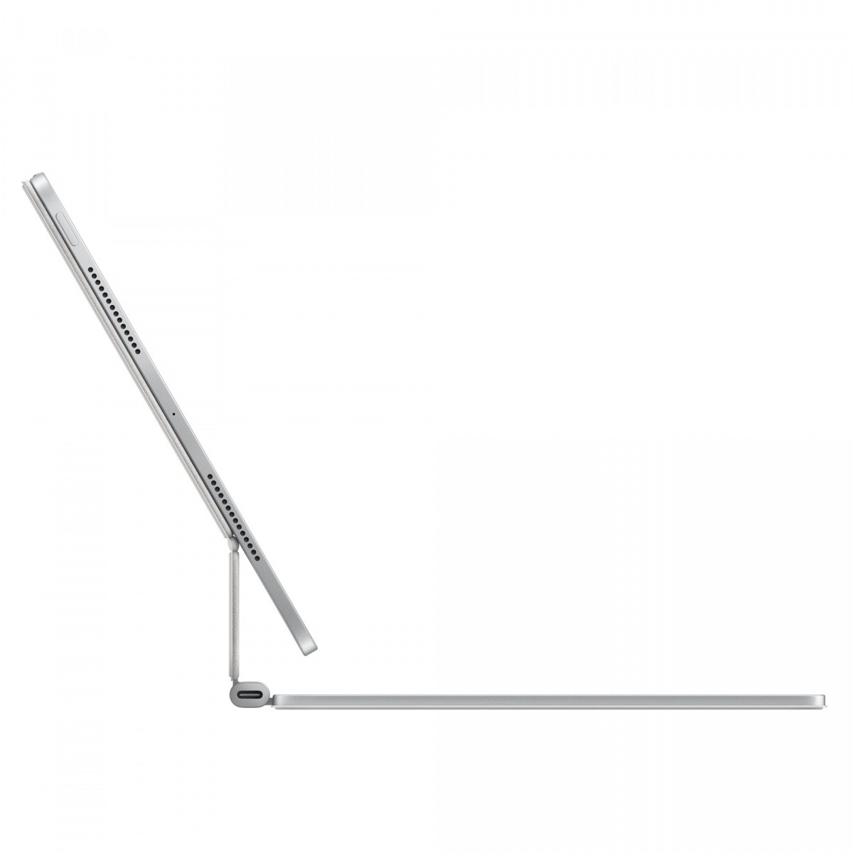 Le clavier complet rétroéclairé avec un mécanisme à ciseaux précis (course de 1 mm) est silencieux et confortable même lors de longues sessions de frappe. La rangée de 14 touches de fonction accélère le travail — de la luminosité et du volume à d’autres raccourcis utiles. Le USB‑C intégré dans la charnière sert à la recharge, laissant ainsi le port de l’iPad libre.