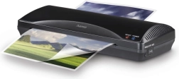 Ce lamináteur traite les documents, mettant en avant sa fonctionnalité lors du laminage de papiers ou de photos et en assurant en même temps la compacité pour une utilisation domestique ou de bureau.