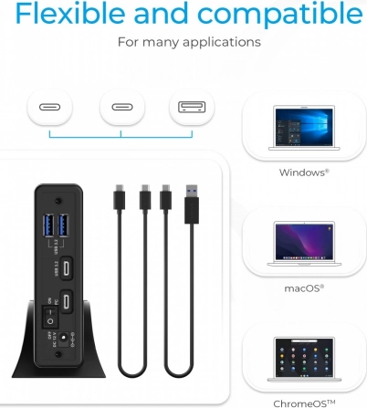 Connectez des périphériques via 1× USB‑C et 2× USB‑A directement sur le boîtier. Économisez les ports de l’ordinateur portable et gardez tout à portée de main.