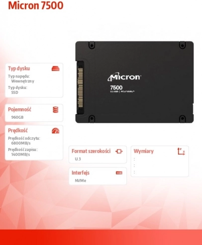 Le Micron 7500 PRO est un SSD d’entreprise haut de gamme pour centres de données, conçu pour une fiabilité et une vitesse maximales dans les environnements PCIe Gen4. Grâce à la NAND à 232 couches et à une architecture à 6 plans avec lecture de lignes indépendante (iWL), il offre des performances stables, une latence inférieure à 1 ms et un excellent rapport performance/consommation.